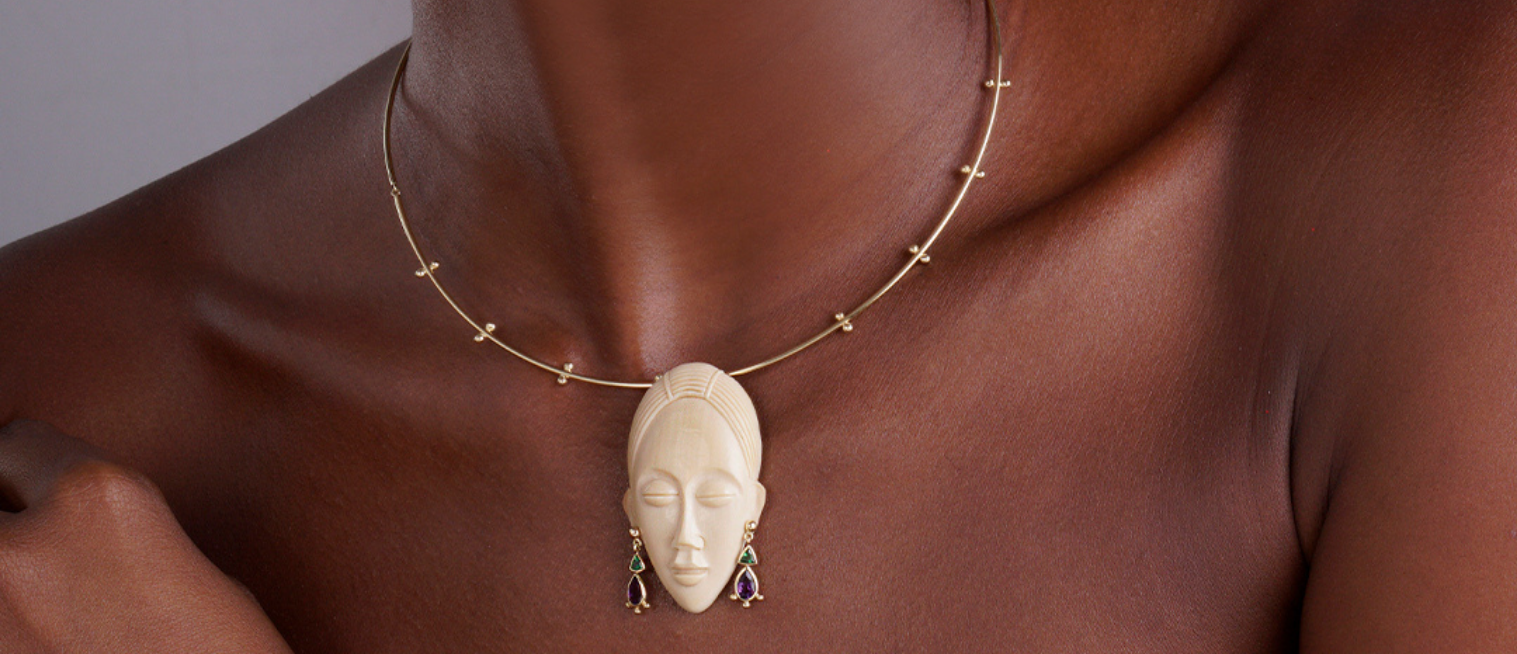 Her designs combine rich natural gemstones, many of which are native to her homeland, with high polish gold. Playing with translucent cut gems and hand carved opaque stones, these colourful jewels are the main protagonists in her creative process.